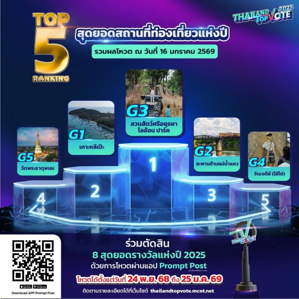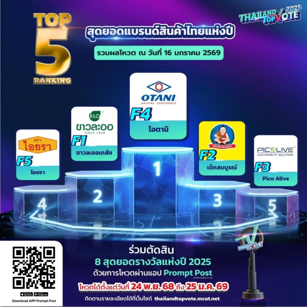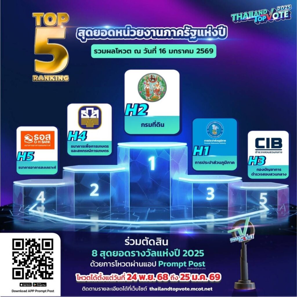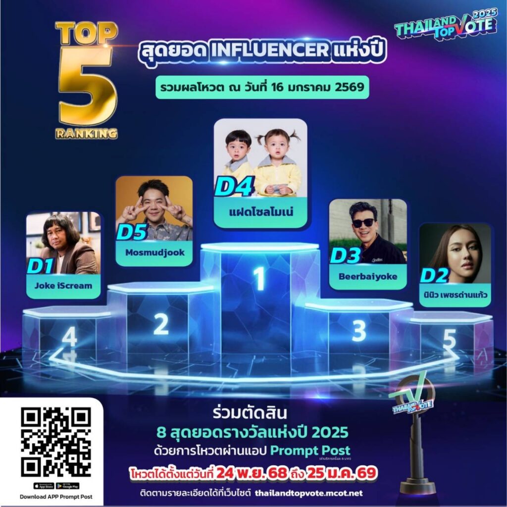 เรียกว่าใกล้โค้งสุดท้าย แต่ก็ยังไม่ท้ายสุด ในการร่วมโหวตรางวัล “Thailand Top Vote 2025” VOICES OF WORTH เสียงแห่งคุณค่า รางวัลที่สร้างความภาคภูมิใจ สร้างแรงบันดาลใจ พร้อมกำลังใจ ให้กับบุคคลและองค์กรในหลากหลายวงการ จากการร่วมมือระหว่าง บริษัท อสมท จำกัด (มหาชน) และ บริษัท ไปรษณีย์ไทย จำกัด กับ 8 รางวัลที่มาจากการโหวตของคนทั้งประเทศ และผู้ที่ก้าวเข้าสู่ TOP 5 ของประเทศ ในแต่ละสาขา โดยล่าสุด RANKING 5 อันดับ ก่อนปิดโหวตในวันอาทิตย์ที่ 25 มกราคมนี้ เรียกว่าผลโหวตเหนี่ยวใจมาก ในแต่ละสาขา