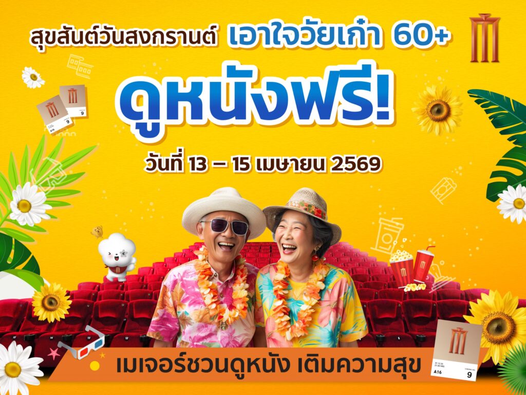 เมเจอร์ ซีนีเพล็กซ์ กรุ้ป ตอกย้ำความเป็นผู้นำด้านความบันเทิงที่ตอบโจทย์ทุกเจเนอเรชั่น เดินหน้าสร้างโมเมนต์แห่งความสุขให้ครอบครัวไทยในช่วงเทศกาลสงกรานต์และวันผู้สูงอายุแห่งชาติประจำปี 2569 ผ่านกิจกรรม “สุขสันต์วันสงกรานต์ เอาใจวัยเก๋า 60+ ดูหนังฟรี” มอบสิทธิ์รับชมภาพยนตร์ฟรี รวม 30,000 ที่นั่ง ที่โรงภาพยนตร์ในเครือเมเจอร์ ซีนีเพล็กซ์ ทุกสาขาทั่วประเทศ เพื่อสร้างรอยยิ้มและประสบการณ์สุดพิเศษให้กับผู้สูงอายุ ตั้งแต่วันที่ 13-15 เมษายนนี้