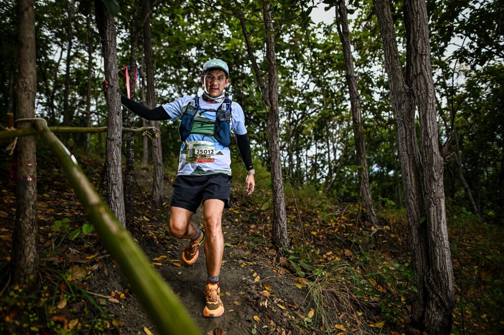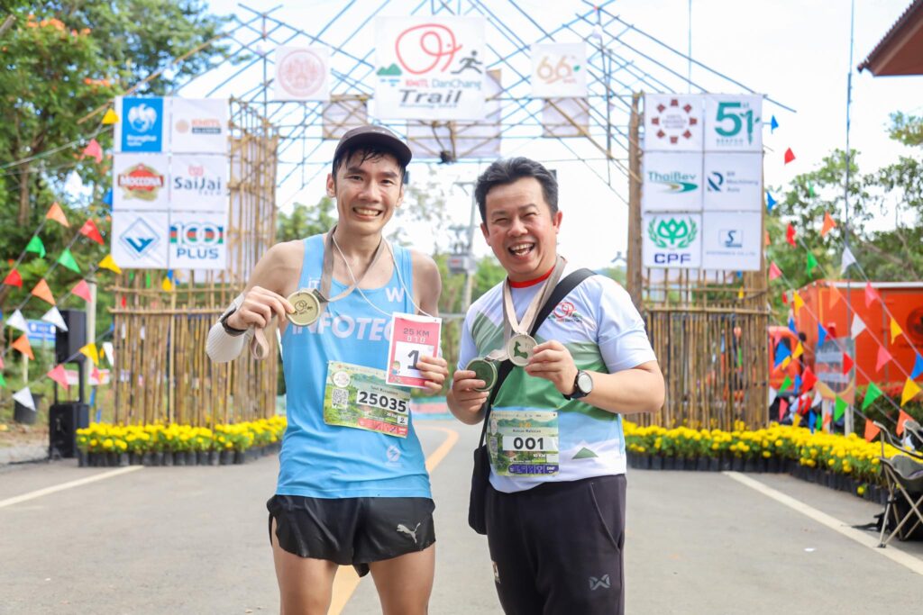 นายธนัส วิจิตรสุนทร (คนซ้าย) นักวิ่งอัลตร้ามาราธอนทีมชาติไทยสังกัดทีม Puma Running Thailand เข้าเส้นชัยด้วยเวลา 2.55.52 เป็นอันดับที่ 1 ในระยะทาง 25 กม. และ รศ. ดร.คมสัน มาลีสี (คนขวา) อธิการบดี สจล. เข้าร่วมวิ่งในระยะทาง 10 กม.